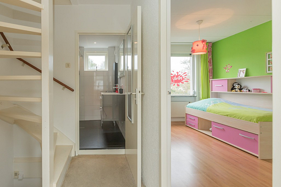 Overloop, aan de voorzijde de prachtig betegelde badkamer met een heerlijke inloopdouche, een wastafelmeubel, een wandcloset en ingebouwde sfeerverlichting. De eerste aan de voorzijde gelegen slaapkamer heeft een lichte laminaatvloer en een ingebouwde kast. De slaapkamer aan de achterzijde is riant en gelegen over de gehele breedte van de woning, de kastenwand met schuifpanelen zorgt voor meer dan voldoende bergruimte, de ramen van deze kamer zijn voorzien van rolluiken.