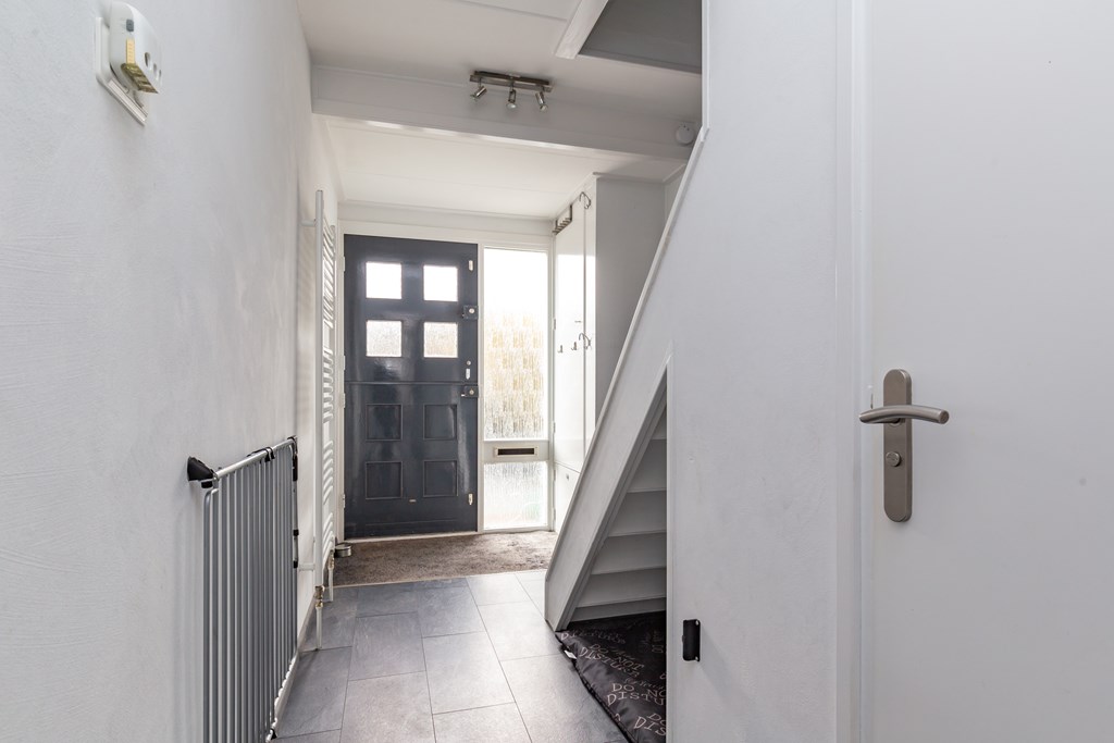 Entree, hal met de meterkast (10 groepen), bergruimte onder de trap en de toiletruimte met een wandcloset en een fonteintje. De meer dan royale aan de achterzijde uitgebouwde woonkamer met aan de voorzijde vrij uitzicht heeft een fraaie laminaatvloer, lichte wanden, ingebouwde sfeerverlichting en openslaande deuren naar de verzorgde achtertuin. De open keuken is in aangename lichte kleuren uitgevoerd en is voorzien van een groot dakraam en diverse inbouwapparatuur zoals een spoelbak, een vaatwasser, een gaskookplaat met afzuigkap, een oven, een magnetron en een koelkast, de keuken heeft een toegangsdeur naar de achtertuin.