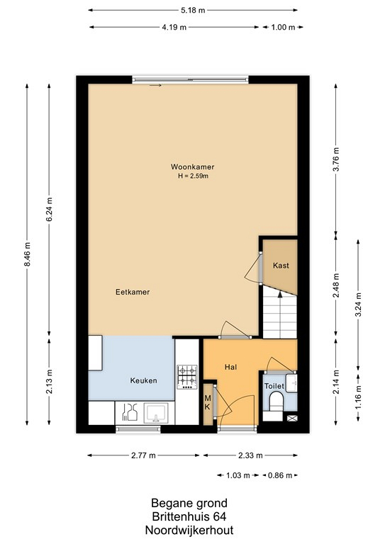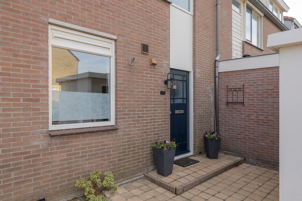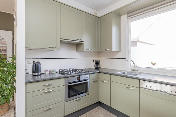Entree, hal met de meterkast, de garderobe en de toiletruimte. De aangenaam lichte woonkamer heeft een siergrindvloer met vloerverwarming, de verdeler bevindt zich in kast onder de trap. Via een schuifpui is de achtertuin te bereiken, het zonnescherm zorgt ervoor dat het hier ook op heetste dagen van het jaar prima vertoeven is. De keuken ligt aan de voorzijde en heeft uitzicht op de straat. De keuken is voorzien van diverse inbouwapparatuur zoals een oven, een gaskookplaat met afzuigkap, een close-in-boiler, een koelkast en een vriezer.