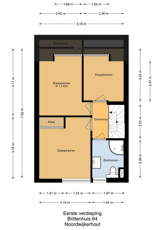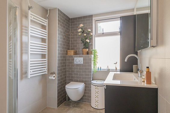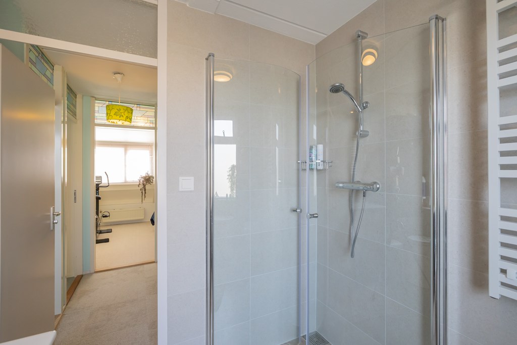 Overloop, de met smaak betegelde badkamer dateert van 2022 en heeft een halfronde douchecabine, een wandcloset, een wastafelmeubel, een kast en een spiegel met verlichting. Aan de voorzijde ligt de ruime (ouder) slaapkamer. Aan de achterzijde liggen nog twee volwaardige slaapkamers, deze hebben beide een dakkapel.