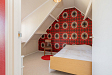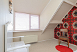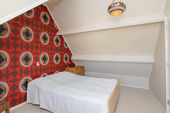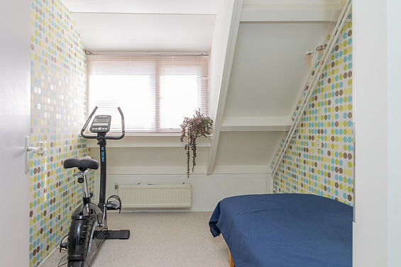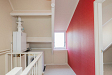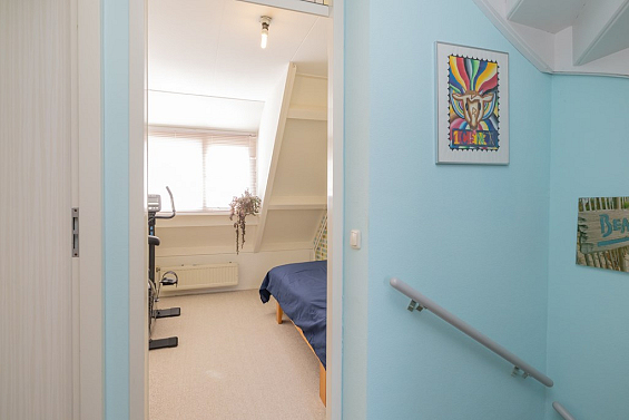 Overloop met de opstelling van de cv-ketel (Intergas 2021), de omvormer voor de zonnepanelen en de aansluitingen voor de wasapparatuur. De ruime zolderkamer heeft een dakkapel aan de voorzijde en veel extra bergruimte achter de schotten.
