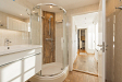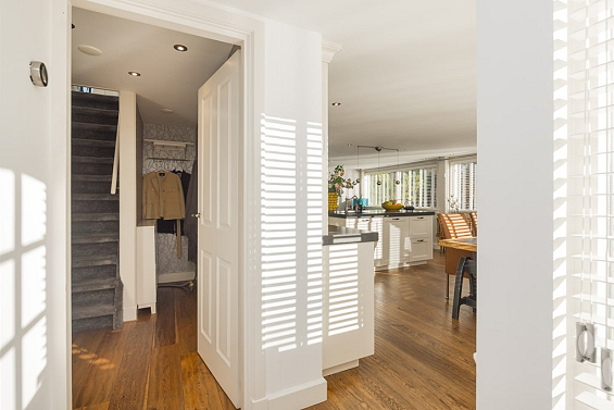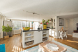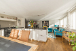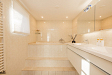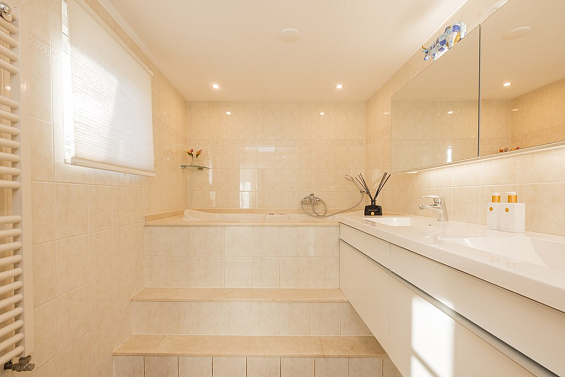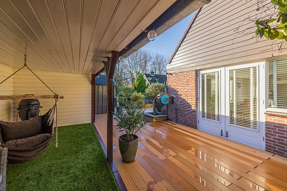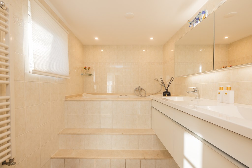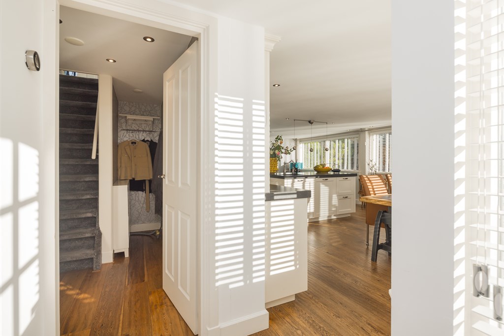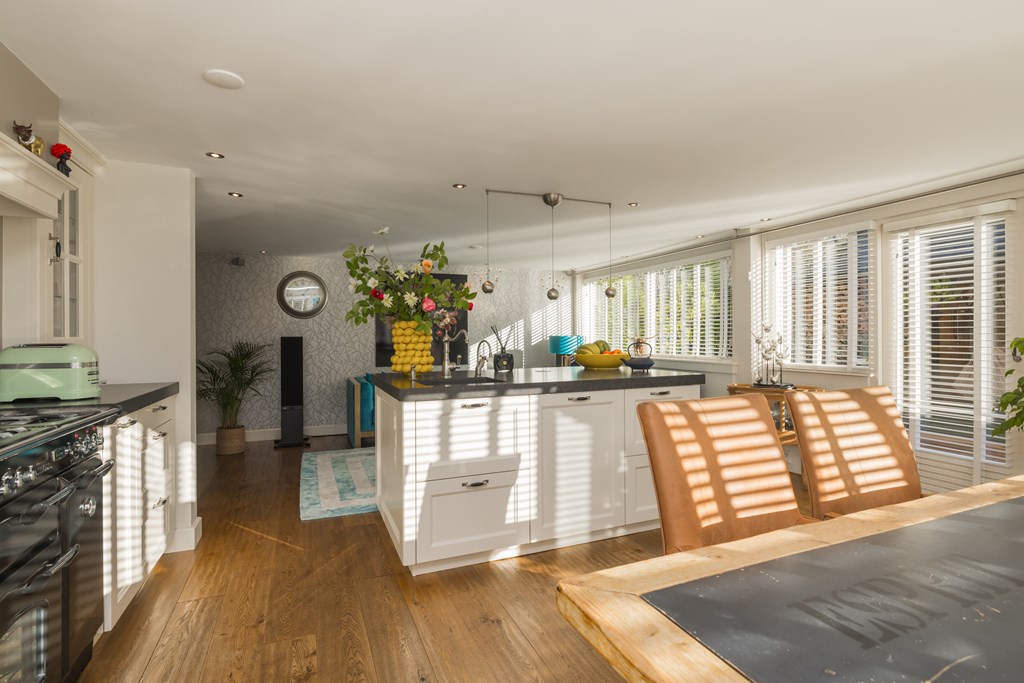 Entree, hal met de meterkast en de toiletruimte met een fonteintje en ventilatie. In de uitbouw bevindt zich de prachtige badkamer met een halfronde douchcabine, ingebouwde verlichting, een dubbel wastafelmeubel en een verhoogd gelegen en zeer luxueus ligbad. De woonkamer en de eetkeuken zijn uitermate sfeervol, het is werkelijk een lust voor het oog! De in lichte kleur uitgevoerde en met de hand gemaakte keuken heeft een prachtig keukenblad van Belgische natuursteen en diverse inbouwapparatuur zoals een 4-pits gasfornuis (Falcon) met een wok brander met daaronder 3 ovens. Er is een keukeneiland met de vaatwasser (Miele), veel extra kastruimte, een spoelbak en een Quooker kraan. Er staat een losse koel/vries combinatie deze kan worden overgenomen. Via de openslaande deuren is de keurig verzorgde tuin te bereiken. De woonkamer heeft een fraaie houten vloer en ingebouwde sfeerverlichting, via de woonkamer is de kast onder de trap bereikbaar met de opstelling van de wasmachine.