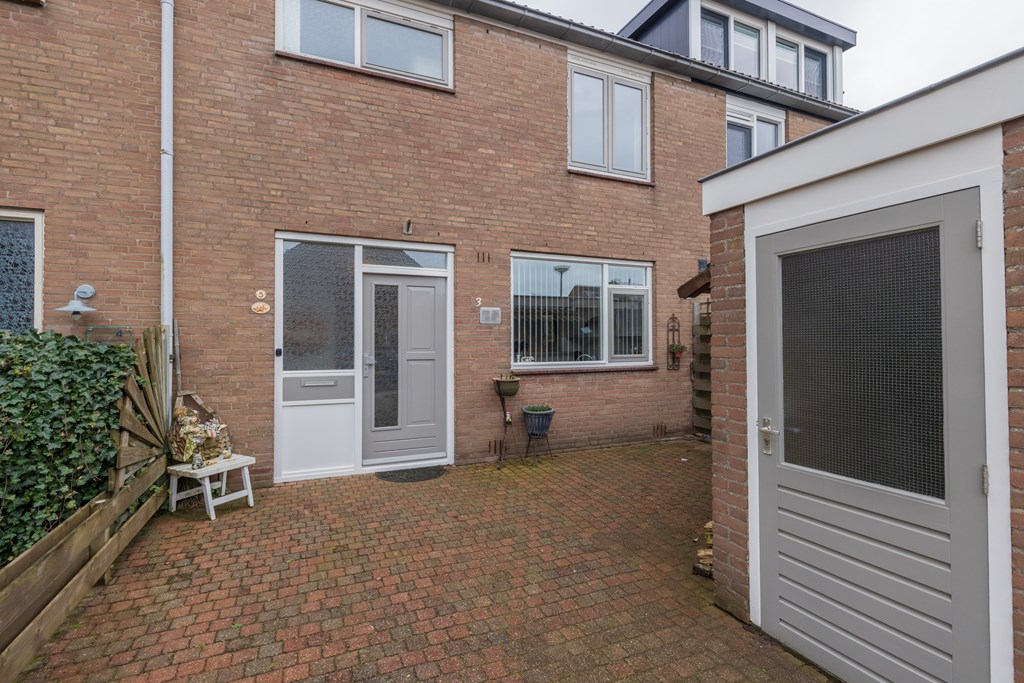 In de voortuin staat een stenen berging met elektriciteit. De diepe achtertuin is volledig betegeld en heeft een zonnescherm over de gehele breedte van de woning. De tuin is achterom bereikbaar.
