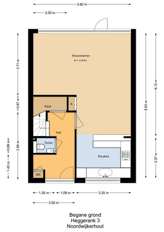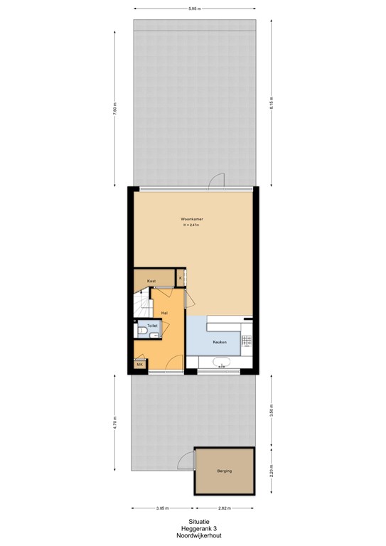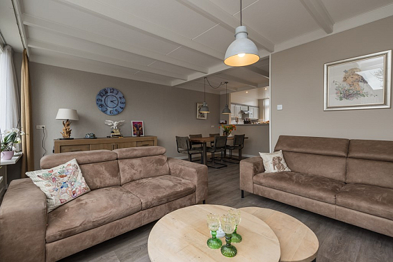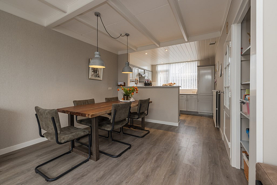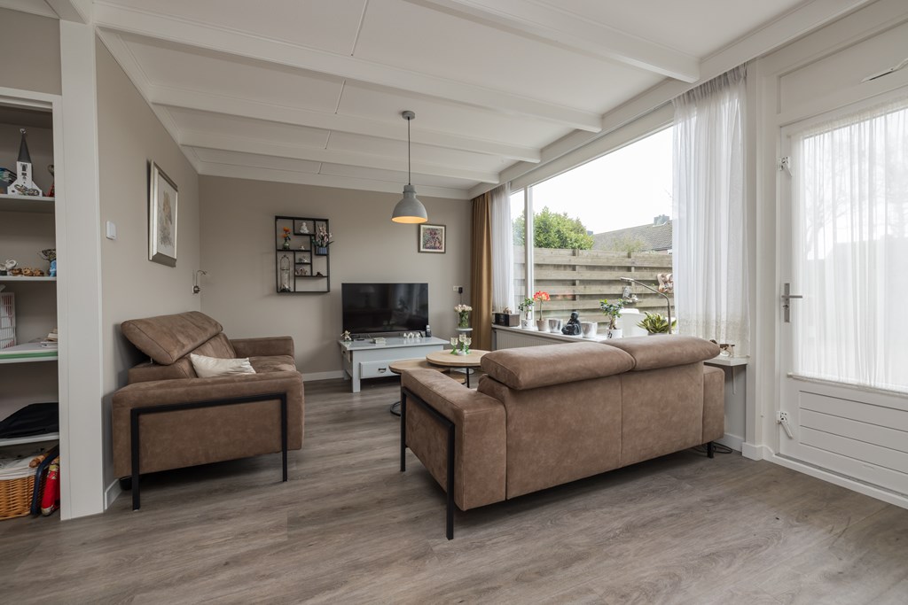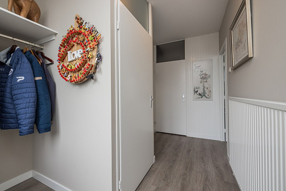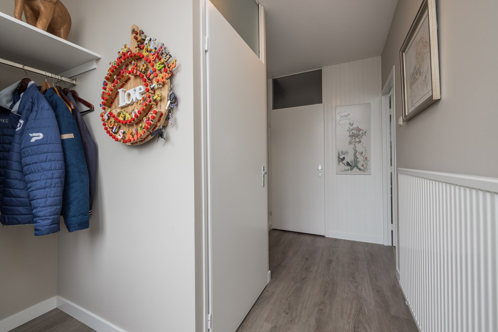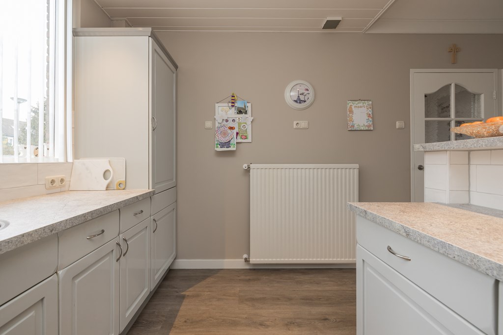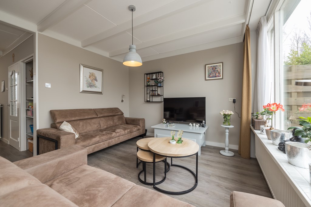 Entree, de hal met de meterkast, de garderobe en bergruimte onder de trap met de verdeler voor de vloerverwarming. De toiletruimte is met smaak vernieuwd en voorzien van een wandcloset en een fonteintje. De keuken is gelegen aan de voorzijde van de woning en is uitgerust met een vriezer, een koelkast, een close-in-boiler, een dubbele spoelbak, een gaskookplaat en een afzuigkap. De woonkamer heeft een PVC-vloer met comfortabele vloerverwarming en biedt uitzicht op de verzorgde en aangenaam diepe achtertuin. Een houten schutting waarborgt de privacy, de tuin is achterom bereikbaar.
