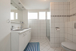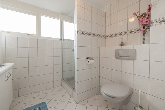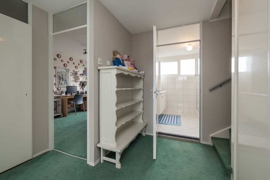 Overloop met aan de voorzijde de ruime en volledig in lichte kleur betegelde badkamer met een wandcloset, een douchecabine, een wastafelmeubel met dubbele spoelbak en een handdoekradiator. De eerste slaapkamer is gelegen aan de voorzijde en heeft ingebouwde kastruimte. Aan de achterzijde is er nog een tweede slaapkamer eveneens met ingebouwde kasteruimte en tenslotte de derde slaapkamer met uitzicht over de achtertuin.