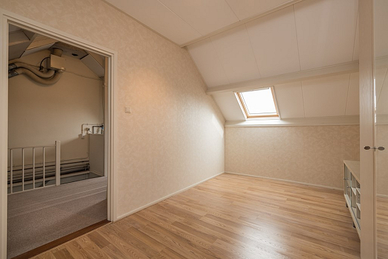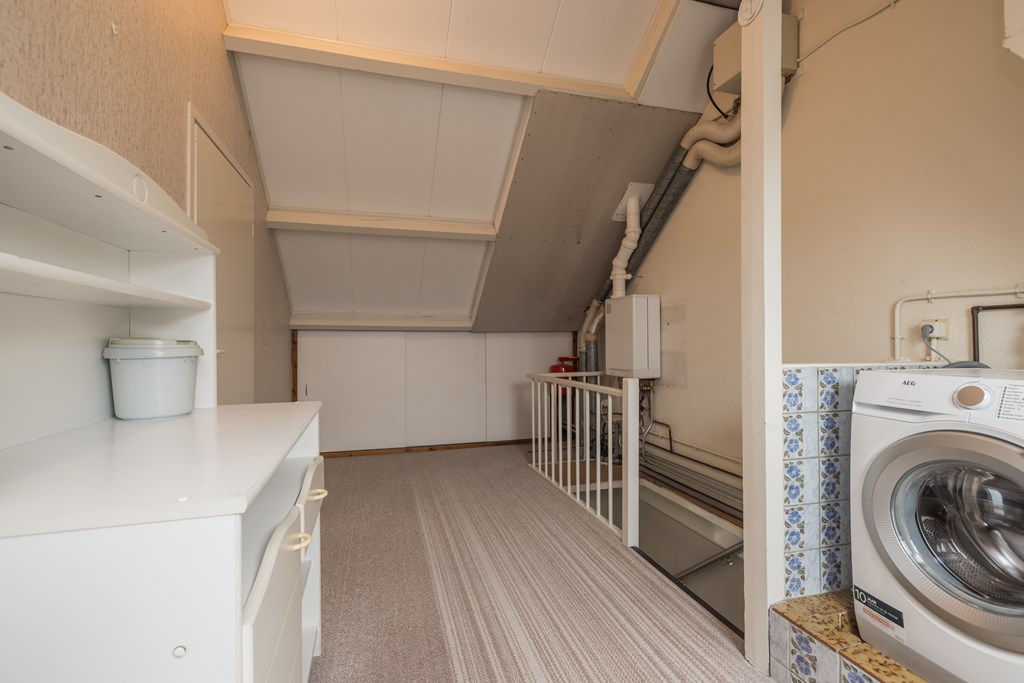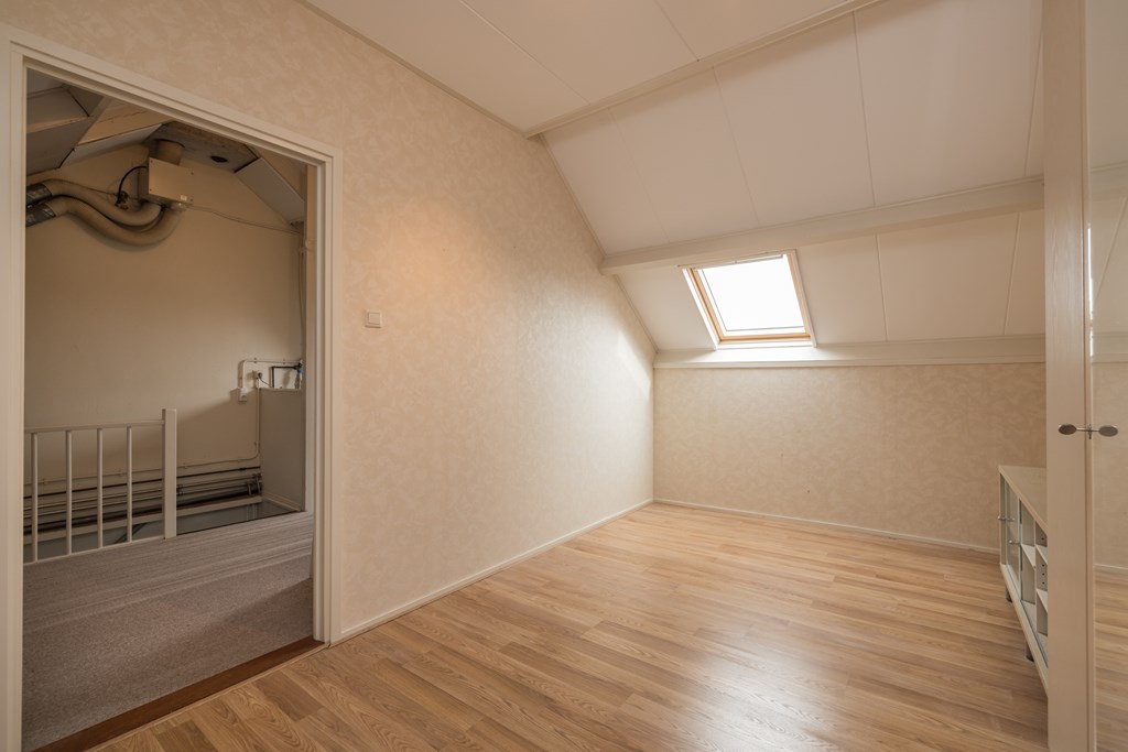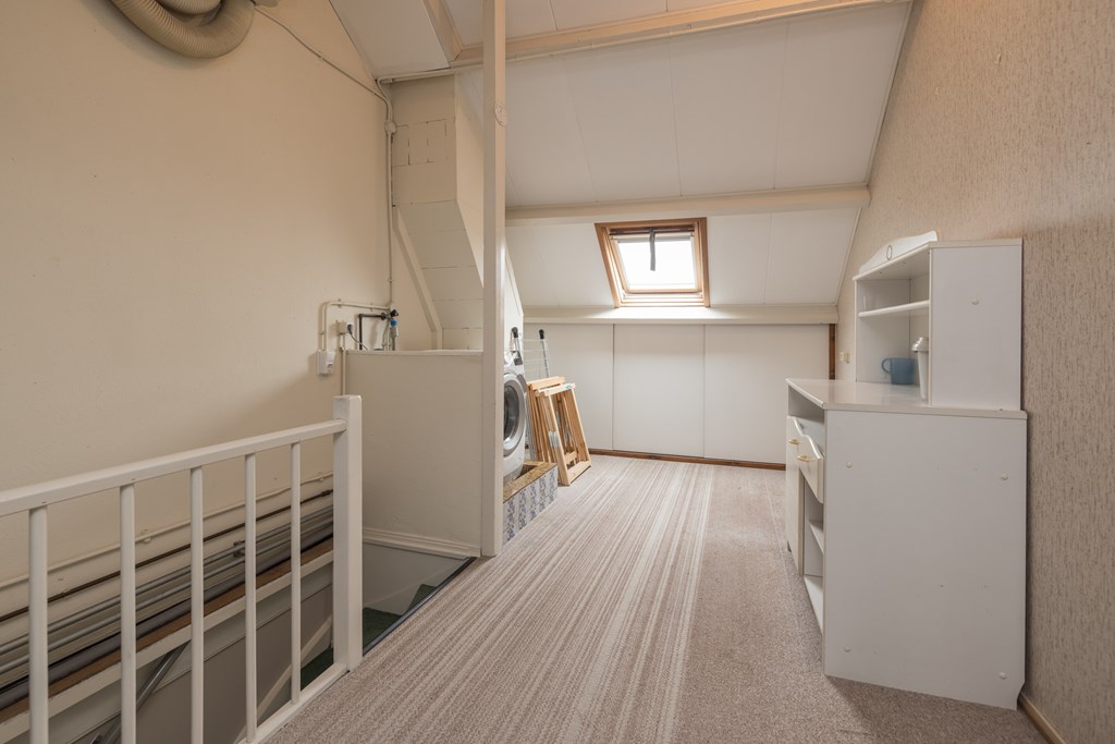 De zolder heeft een grote overloop met een dakraam aan de achterzijde en veel bergruimte achter de schotten aan de voor- en achterzijde. Op de overloop hangt de CV-ketel (Intergas HRE 2021) en is er ook een aansluiting voor de wasapparatuur. De zolderkamer is aangenaam licht door het dakraam aan de achterzijde.