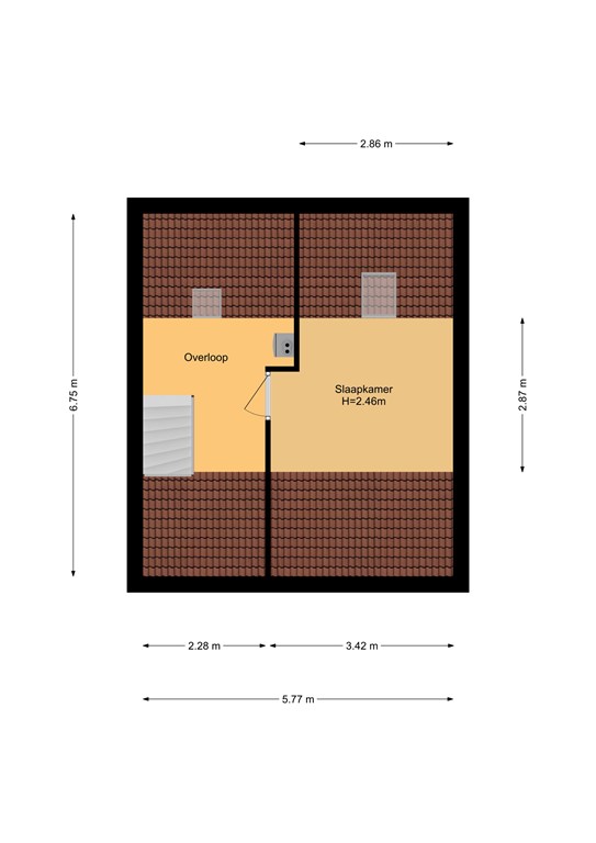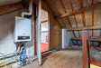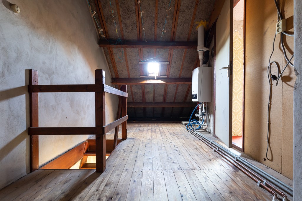 Overloop met de opstelling van de cv-ketel (Nefit 2020), de zolderkamer is voorzien van knieschotten voor extra bergruimte en een dakraam aan de achterzijde.