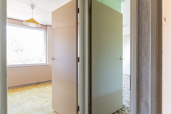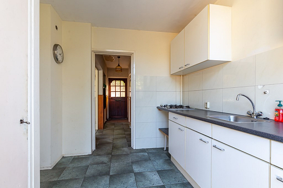 Entree, ruime hal met de meterkast en de toiletruimte met een wandcloset. De woonkamer is in lichte kleuren uitgevoerd, heeft een laminaatvloer en ingebouwde kastruimte. In de keuken vindt u ingebouwde kastruimte, de aansluitingen voor de wasapparatuur, een toegangsdeur naar de heerlijke diepe achtertuin en een keukenblok in neutrale kleurstelling met een gaskookplaat, een spoelbak en een close-in-boiler.