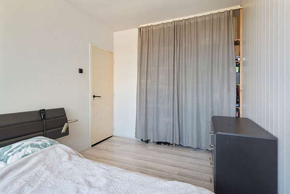 Entree op de eerste verdieping, hal met de toiletruimte, de meterkast, een kast onder de trap en de badkamer met een wastafel en een douche, deze badkamer wordt thans alleen als berging gebruikt. De keuken is gelegen aan de voorzijde en is voorzien van diverse inbouwapparatuur zoals een gasfornuis, een afzuigkap, kastruimte en een losse koelkast en vriezer. Aan het eind van de gang ligt er een ruime slaapkamer met veel bergruimte. De riante woonkamer heeft een plavuizenvloer, een elektrische haard en is gelegen aan de achterzijde met vrij uitzicht over het zeer groenrijke speelveldje. Vanuit de woonkamer is het balkon over de gehele breedte van de woning bereikbaar, de bezonning vanuit het zuidwesten is optimaal!